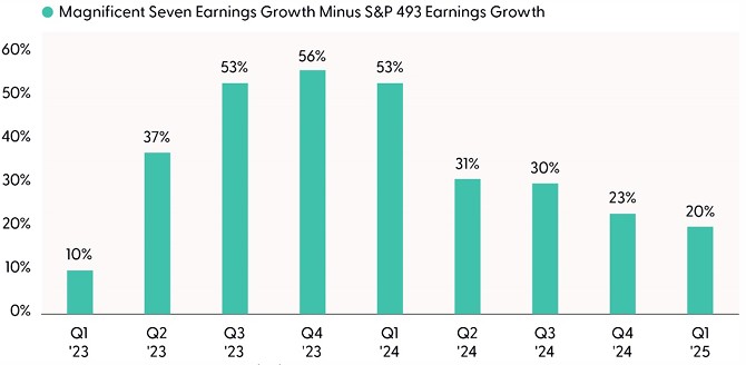 Conversely, the only sectors that detracted from overall earnings growth were energy and consumer staples. Energy struggled with lower oil prices, as the average price of West Texas Intermediate (WTI) crude dropped 7% from Q1 2024 to Q1 2025, while weakness in refiners also weighed on the sector’s profitability. Consumer staples earnings were hurt by food companies struggling with inflation and trade tensions.