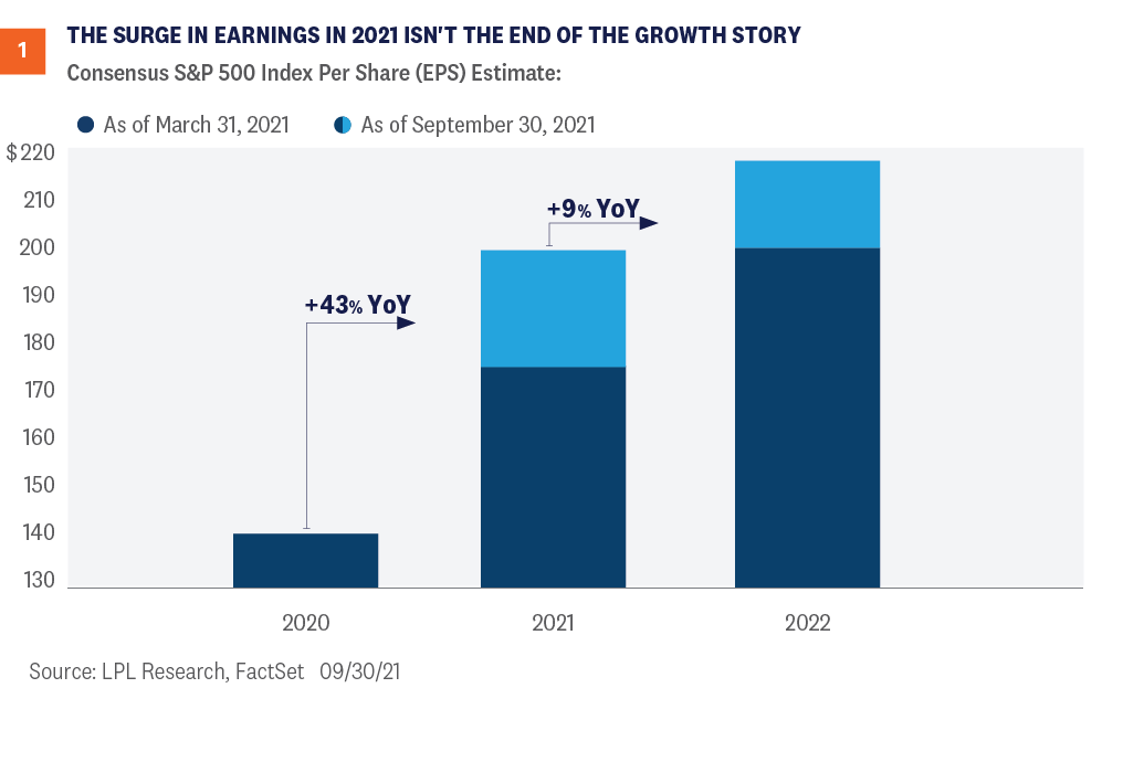 Looking at valuations first, they are elevated—but strong earnings gains during the ongoing economic recovery and the recent stock market pullback have lowered the price-to-earnings ratio (P/E) for the S&P 500 to about 20.5. Interestingly, the S&P 500 is up 16% year-to-date while the consensus estimate for the index’s EPS in 2021 has risen 20% since January 1, showing that stocks are actually cheaper now than they were at the start of this year. We believe still low interest rates justify current valuation levels, but if rates rise next year as we expect, P/E multiples are unlikely to rise and may edge lower. That means earnings growth will likely be the primary driver of stock market gains in 2022.