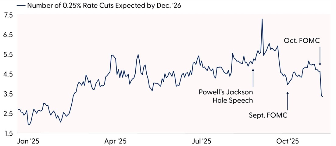 The October FOMC meeting delivered the widely expected 0.25% rate cut, but the tone was notably less dovish than markets anticipated. While the Fed acknowledged rising risks to the labor market and ended QT earlier than planned, Chair Powell’s comments introduced uncertainty around future rate cuts. The lack of clear forward guidance, combined with growing dissent among policymakers, has reduced visibility and increased volatility risk. Treasury yields rose, stocks pulled back, and rate cut expectations were repriced lower, reflecting a more cautious stance from investors.